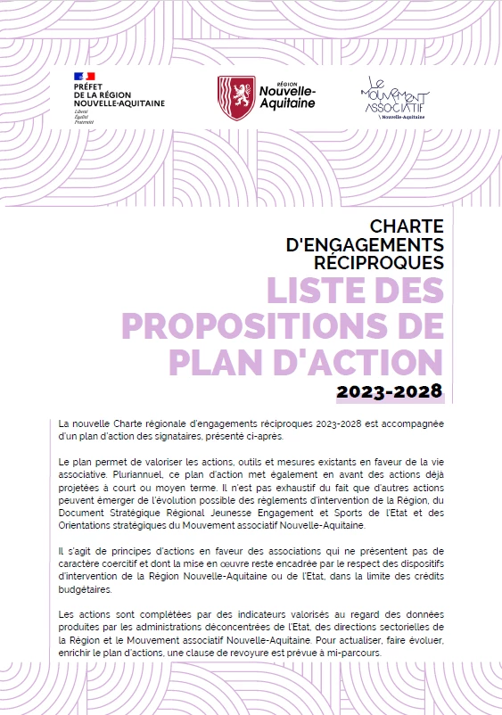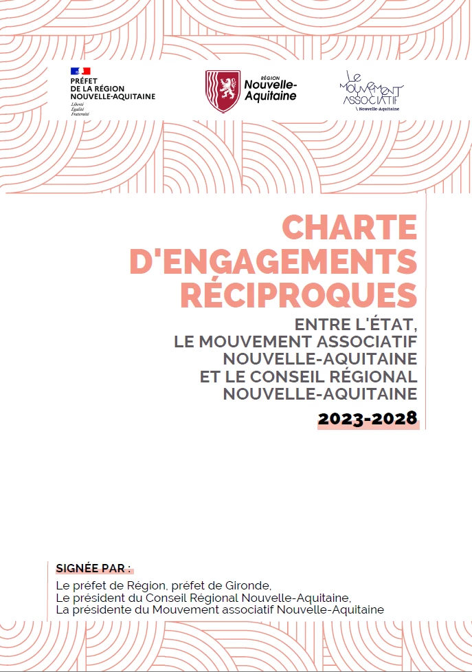 Le Mouvement associatif Nouvelle-Aquitaine est signataire de la Charte d’engagements réciproques en Nouvelle-Aquitaine entre la Région, l’État et le Mouvement Associatif Nouvelle-Aquitaine. La Charte établit pour 6 ans (2023- 2028), les engagements réciproques des 3 partenaires.